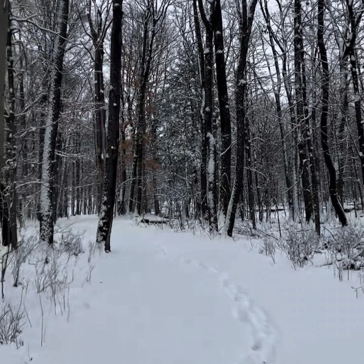 Walking through a path in woods in the winter.